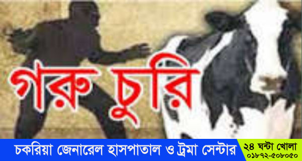কক্সবাজারের ঈদগাঁওয়ের দক্ষিণ মেহেরঘোনায় চুরির ঘটনা ঘটেছে। স্থানীয় মিজানুর রহমান বাবুলের গোয়ালঘর থেকে গতকাল রাতে ২টি গরু চুরি হয় বলে জানা যায়।